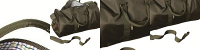 - Zipper front closure with webbing reinforcement